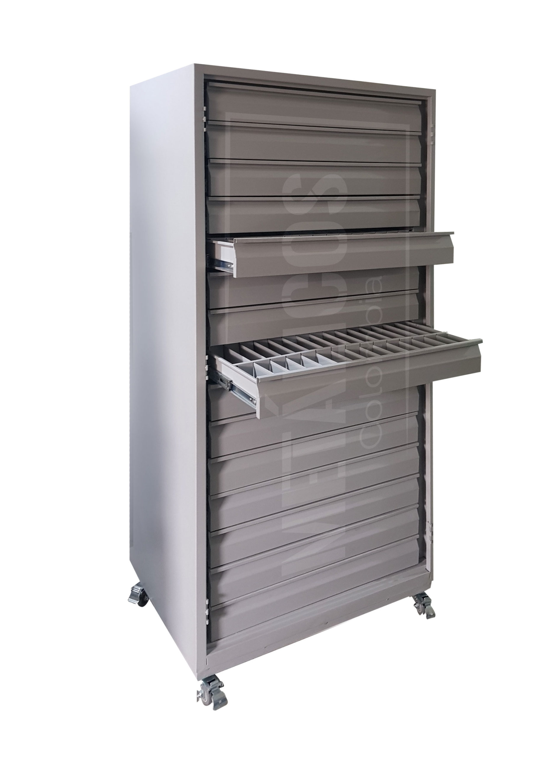Gavetas montadas en correderas full extensión para trabajo pesado, frente de gabeta con manija embebida para amnejo externo de cada una, 04 ruedas de alta resistencia, 2 de ellas con freno, sin seguridad.
