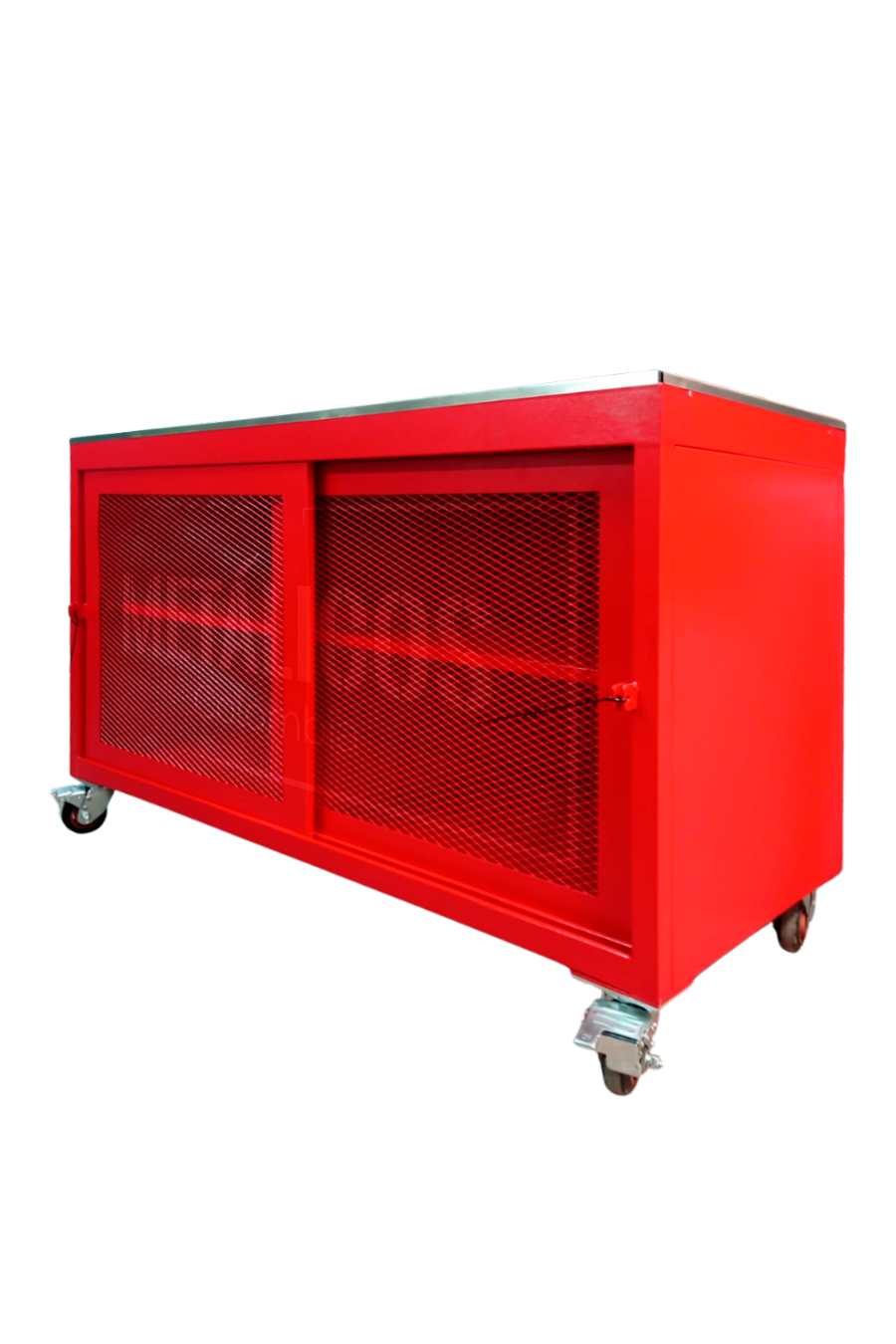 Estructura industrial reforzada. Compartimiento con seguridad. Superficie en acero inoxidable con retención. Puertas en malla. Ruedas para fácil desplazamiento.