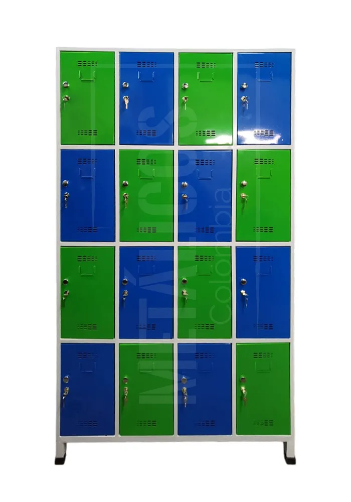 Interior: 1 entrepaño fijo y 1 gancho lateral por compartimiento. Exterior de las puertas: Perforaciones de ventilación. Porta-rótulos para identificación. Manija plástica en polipropileno de alto impacto, color negro. Porta-candado metálico en platina para mayor seguridad. Patas metálicas: Fabricadas en tubo Cold Rolled de 10 cm de alto para mayor estabilidad.